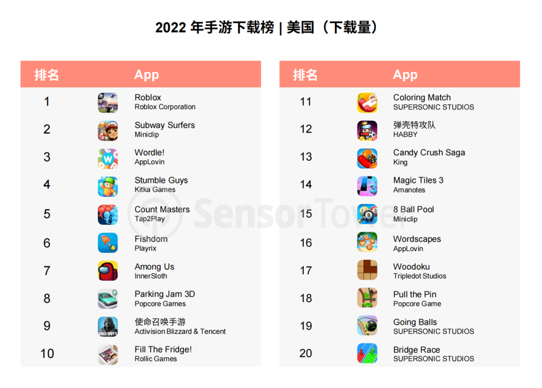全球各重点买量市场中,全球大部分成熟手游买量市场,于2022下半年的买量手游数量同样出现有不同程度的下滑;相反东南亚、巴西新兴市场则稳中有升,热度不减。从增量上看,美国依旧是新增买量手游最高的国家;新兴市场中的东南亚、巴西同样表现抢眼。具体而言,以美国市场为例,该国的休闲类手游买量地位仍然牢固排名首位,且在单品的下载量以及收入的表现上依旧突出。收入层面,经典三消手游《Candy Crush Saga》依靠频繁的关卡更新维持着稳定的用户活跃与营收,并在 2022 年超过《Roblox》重登美国畅销榜榜首。而在 2022 年美国手游下载榜 Top 20 中,共 7 款为超休闲品类,可见该品类巨大的市场潜力。《Dream Piano》领衔出海买量榜