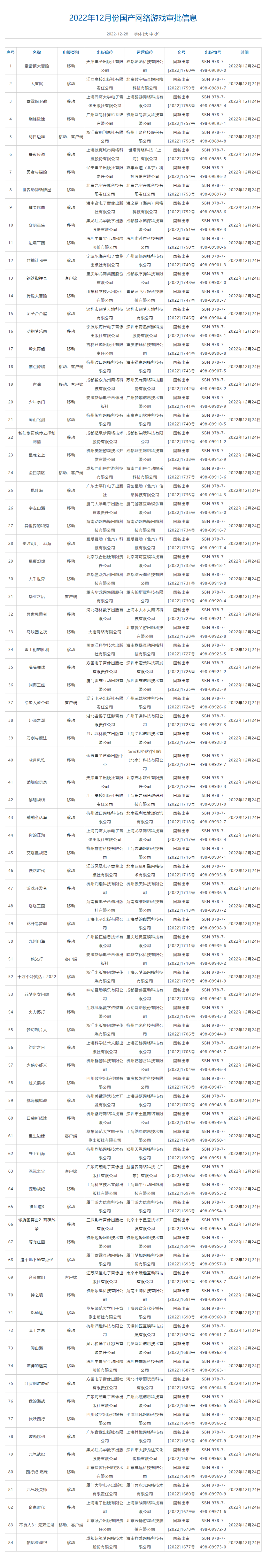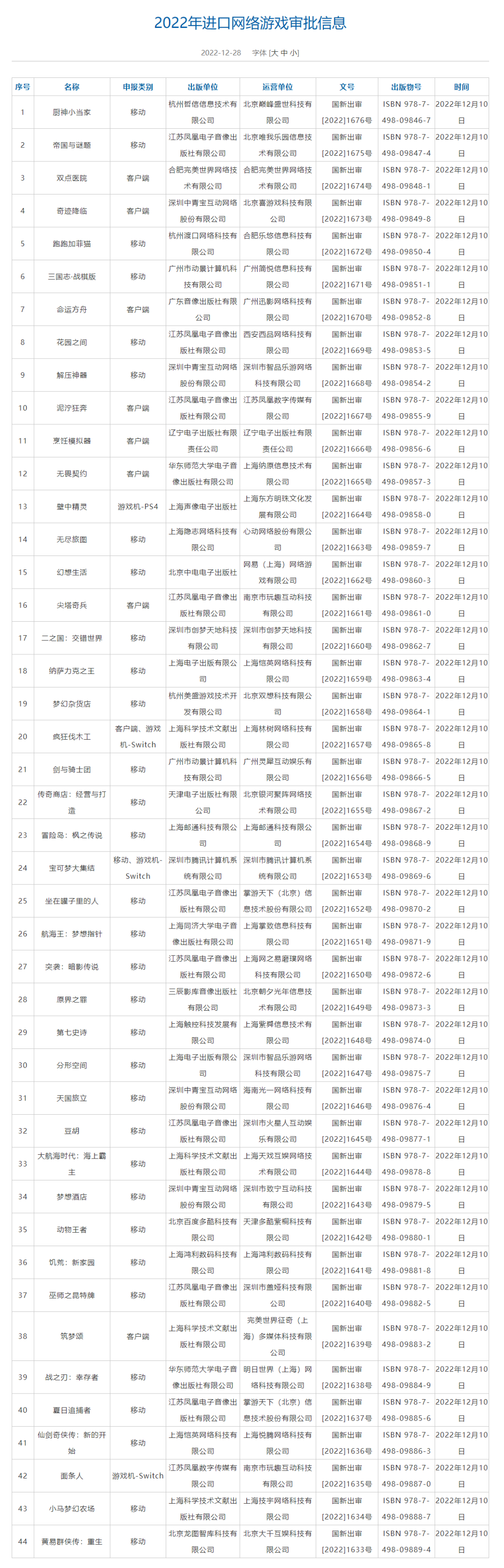 12月28日,国家新闻出版署发放了2022年最后一批游戏版号,共计128款游戏过审。其中,国产游戏84款,进口游戏44款。至此,2022年版号发放全部完成,累计发放531个版号。![]()
