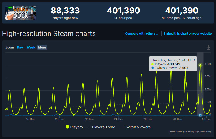 《鹅鸭杀》同时在线人数突破40万大关,这一数据超过了《Apex》、《失落的方舟》等大热作品。由于玩家过多,游戏还于12月28日晚间,发生了短时间的炸服的情况。![]()