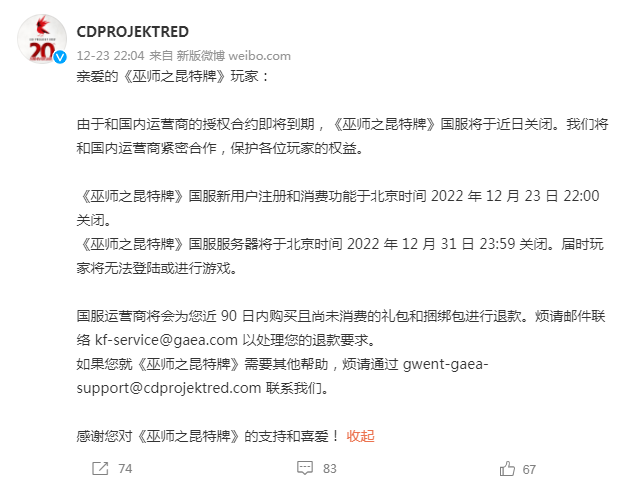 很多厂商旗下产品迟迟拿不到版号,想要自救无非是两条路,精品化或出海,但是无论那条路,都意味着极高的门槛以及更为巨大的投入,这并不是一道很难的选择题,但却是很惨的选择题,虽然广告变现也能提供一些出路,可惜只是缓兵之计。此类厂商,想要去追逐内容精品化,也是心有余而力不足。有相关人士表示,“倘若限制中小制作团队版号的获取,将会限制他们的创作能力,团队需要成长,也需要手握稳定的投入和回报,版号发放的快慢会影响到游戏未来的盈利,也会让团队的进一步投入产生迟疑,严重影响团队发展。”简言之,对很多国内中小厂商而言,版号更像是一个关隘,过了关才能谈其他的。比如今年4月,《进击的兔子》终于拿到了属于自己的版号,但百度早已在2021年Q4忍痛砍掉了游戏团队,我们听到官方说出的最后一句话,是“要看公司是否为了版号再重启项目,或者这游戏就直接不上了”。或是在刚刚发布的进口游戏版号中出现的《巫师之昆特牌》,就在版号下发5天前,CDPROJEKTRED官方微博发布公告,表示由于和国内运营商的授权合约即将到期,《巫师之昆特牌》国服将于12月31日关闭,评论区中很多玩家调侃版号来了,你却走了。![]()
