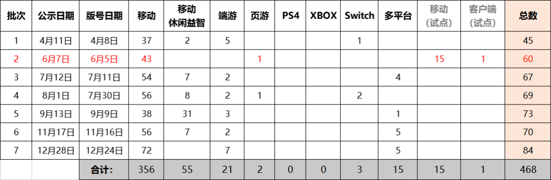另外,多平台同时过审的游戏有所增加,以移动-客户端类最为突出。跨平台游戏的优势在近些年得以凸显,2021年伽马数据曾发布了《2021中国游戏创新品类发展报告——跨平台游戏篇》,表示2021年中国跨平台游戏市场规模有望超700亿元,未来随着云游戏技术以及跨平台研发技术的逐步成熟,会为市场规模的增长提供新的支撑。跨平台一方面可以冲破平台间的界限,促进不同平台玩家间的沟通,另一方面深化用户的属性重叠,让游戏价值得以延展。随着越来越多的厂商开始向跨平台发力,未来版号过审名单中,一款游戏一个版号对应多个平台的跨平台产品或将出现得更加频繁。诸多批次的版号中,2022年6月第一批国产网络游戏版号过审名单有些“画风”不同。该批次版号对申报类别进行了更新,放弃了移动-休闲益智等分类,在类别前加入了国产二字,并新增了国产移动游戏(试点)等类别。彼时很多媒体都猜测此改动与版号审批改革有关,这一改革源自2021年9月3日,国务院印发《关于推进自由贸易试验区贸易投资便利化改革创新若干措施的通知》,其中第十六条措施“开展网络游戏属地管理试点”指出:在符合条件的自贸试验区所在地推进网络游戏审核试点工作(中央宣传部负责)。且该批次版号中包含的15款试点产品,出版单位均来自北京和上海,更是成为了很多人的论点,认为未来也会普通版号和试点版号共存,此举可以在细化审核维度的同时缩短送审、反馈流程,部分企业可由当地试点审批,无需等待版署反馈,版号发放效率会得以提升。但出乎所有人预料,后续几个月的版号名单却回归原样,今年也再没出现过“试点”字样,未来是否还会出现,“试点”的作用如何来体现,是否会让未来游戏版号的审批适当提速,还需静候2023年来解答。![]()