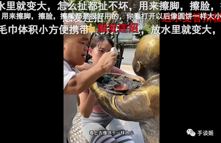 这些视频的流程是,首先是一堆逆天场景,最后转到“这不是饼干这是压缩毛巾,遇水变大变高”上来,有时还有“先擦脚再擦脸”这种逼人想要吐槽的行为,确实挺土味的。最近似乎不卖压缩毛巾改卖春联挂历了,九块九还包邮看起来很便宜,但是你跑集市上买可能更便宜,压缩毛巾大概同理。