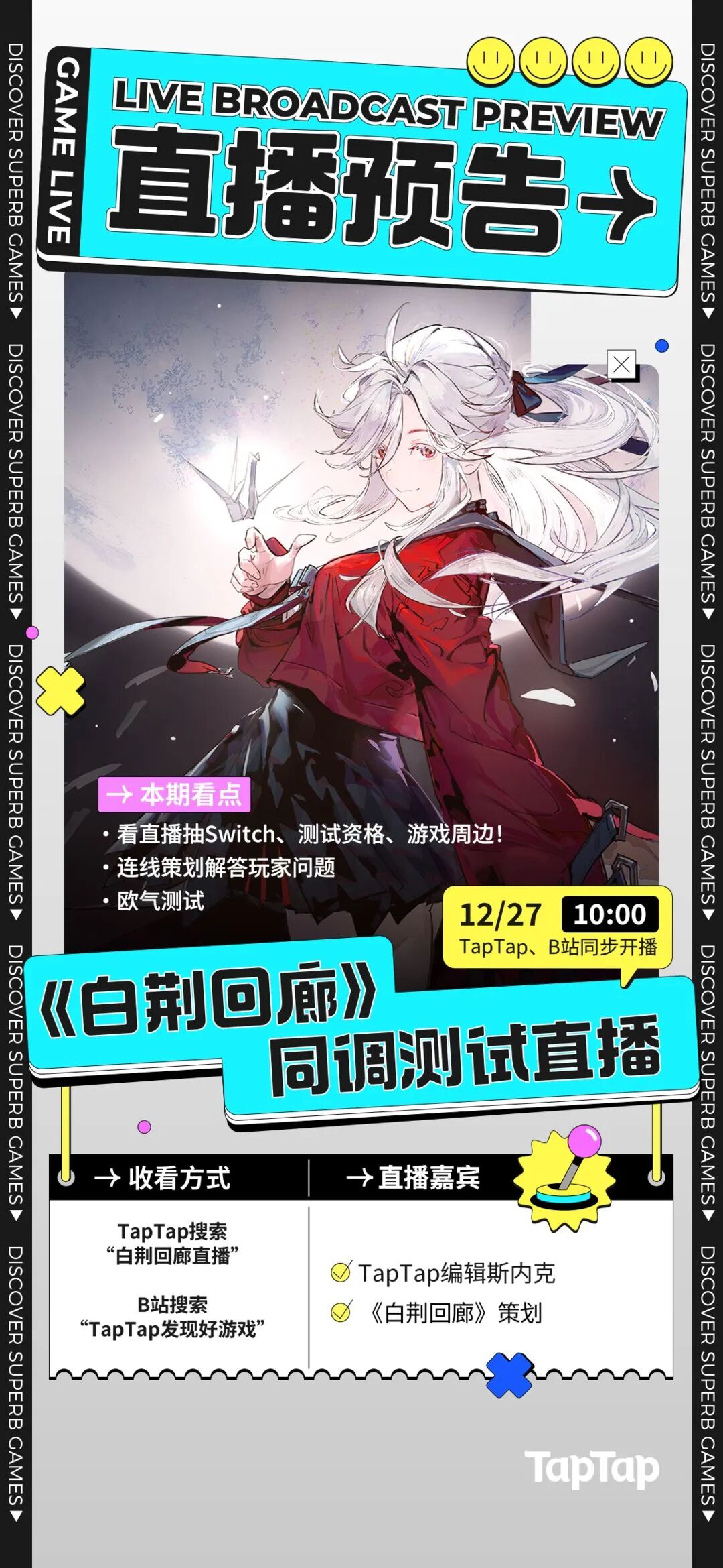 12月27日 10:00,TapTap编辑将连线《白荆回廊》官方团队在「同调测试」开启的同一天,为大家带来第一手的直播试玩,在TapTap客户端收看直播还有《白荆回廊》周边大礼包、Switch主机、测试资格等奖品随机掉落!