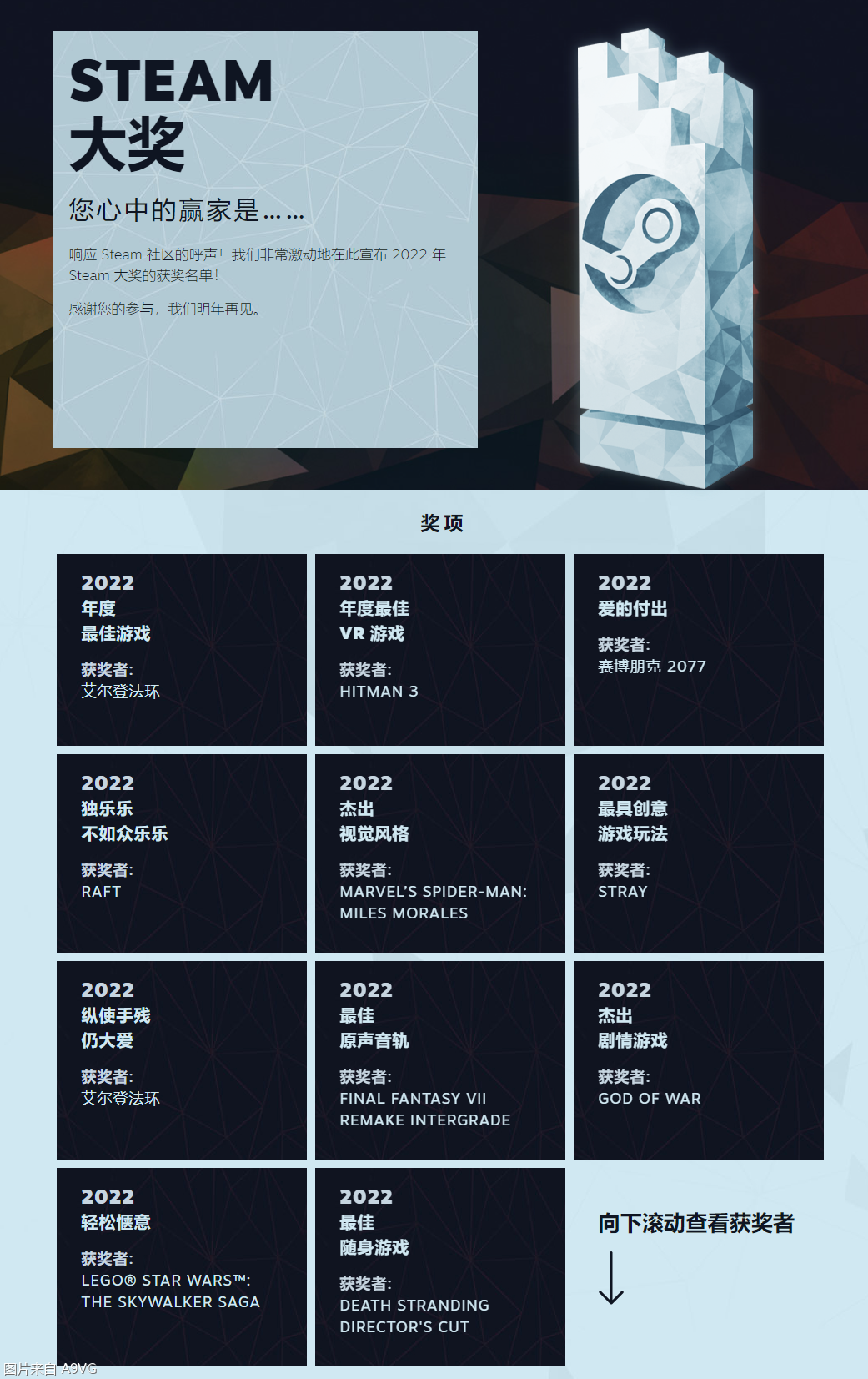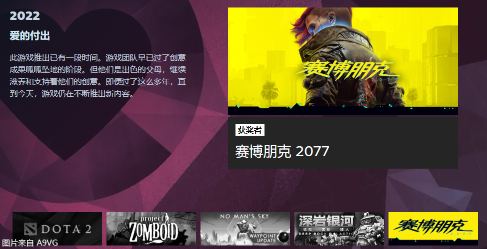 2022年Steam大奖出炉,《艾尔登法环》获得“年度游戏”,《赛博朋克2077》获得“爱的付出”奖,《战神》获得“最佳剧情”,以下为具体获奖名单:年度最佳游戏:艾尔登法环