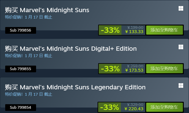 和《极品飞车22》同一天发售的《漫威暗夜之子》,同样也于Steam发售一个月后开启了首次促销。游戏原价199元,-33%折后133.3元,截至1月17日。