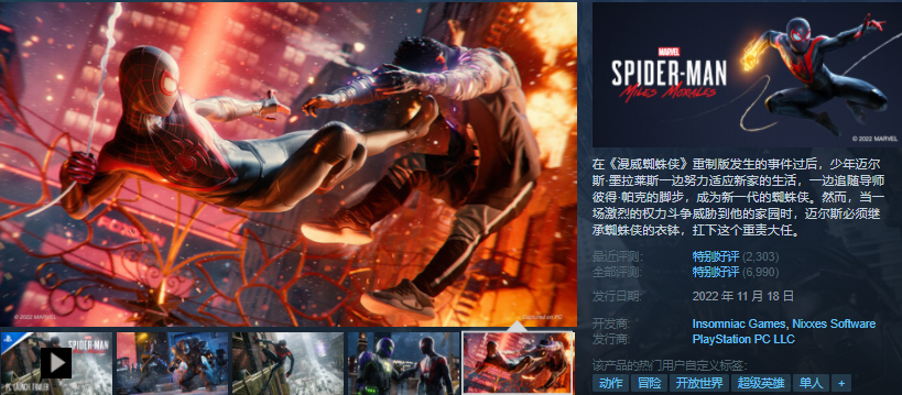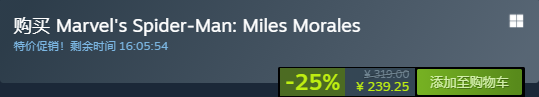 漫威蜘蛛侠: Miles Morales-25% Steam售价:319 折后:239.25(新史低)