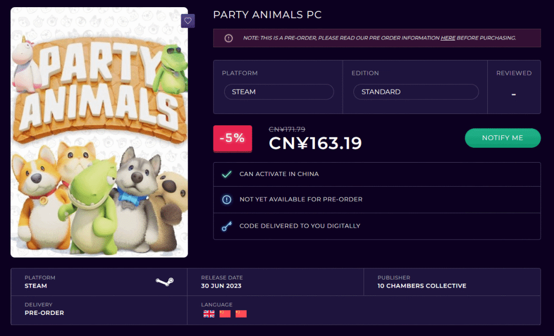 据cdkeys.com页面显示,国产派对聚会游戏《动物派对》将于6月30日发售。定价171.79元(24.59美元)。