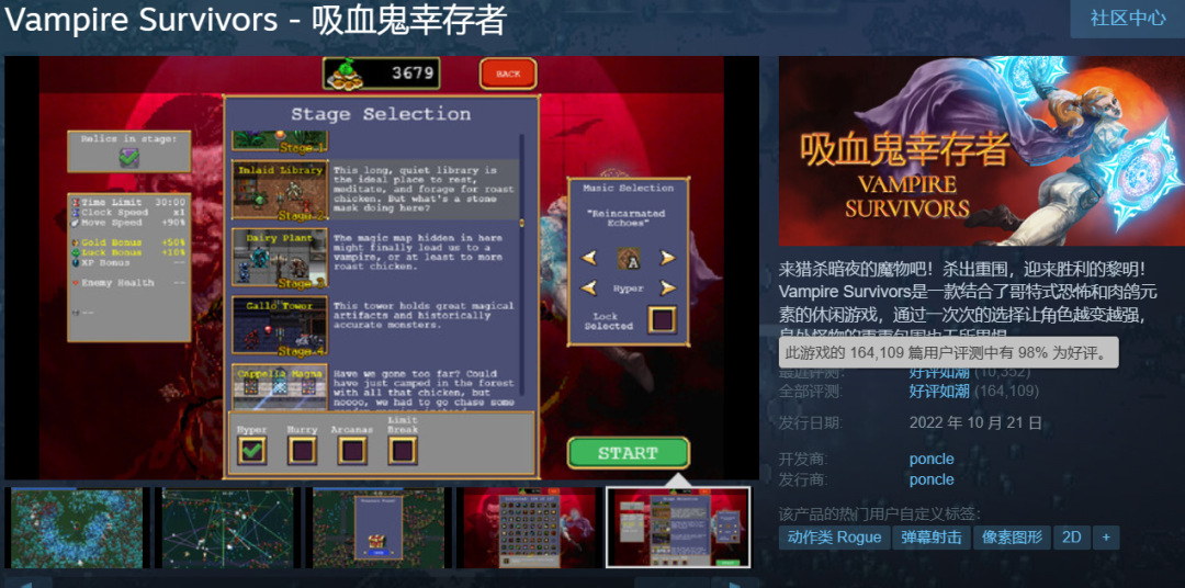 与《鹅鸭杀》不同的是,《吸血鬼幸存者》已经引动了品类的爆发,Steam DB统计的2022年度热门Steam游戏榜单冠军正是这款产品,而海彼网络爆款手游《弹壳特攻队》也被认为是受这款产品启发。今年还能不能再做类似产品出圈是个问题。