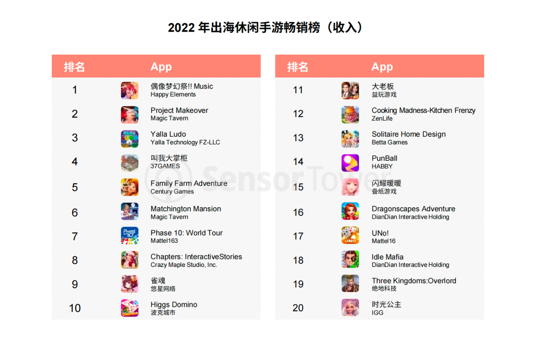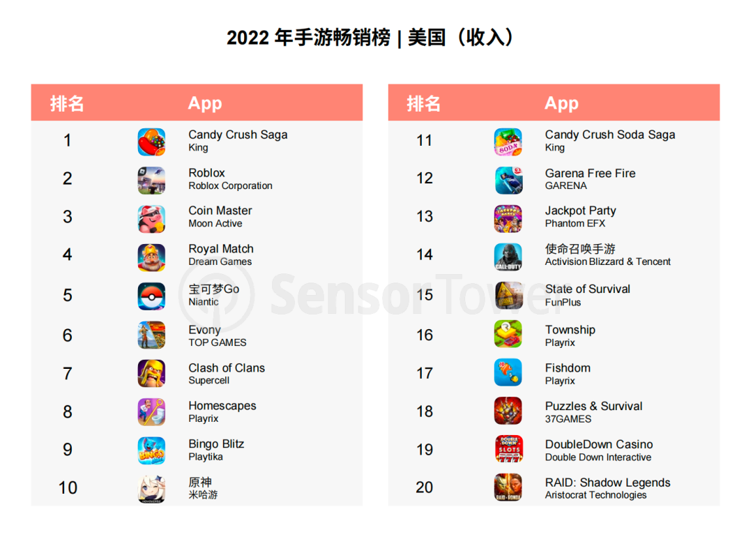 具体而言,以美国市场为例,该国的休闲类手游买量地位仍然牢固排名首位,且在单品的下载量以及收入的表现上依旧突出。收入层面,经典三消手游《Candy Crush Saga》依靠频繁的关卡更新维持着稳定的用户活跃与营收,并在 2022 年超过《Roblox》重登美国畅销榜榜首。而在 2022 年美国手游下载榜 Top 20 中,共 7 款为超休闲品类,可见该品类巨大的市场潜力。