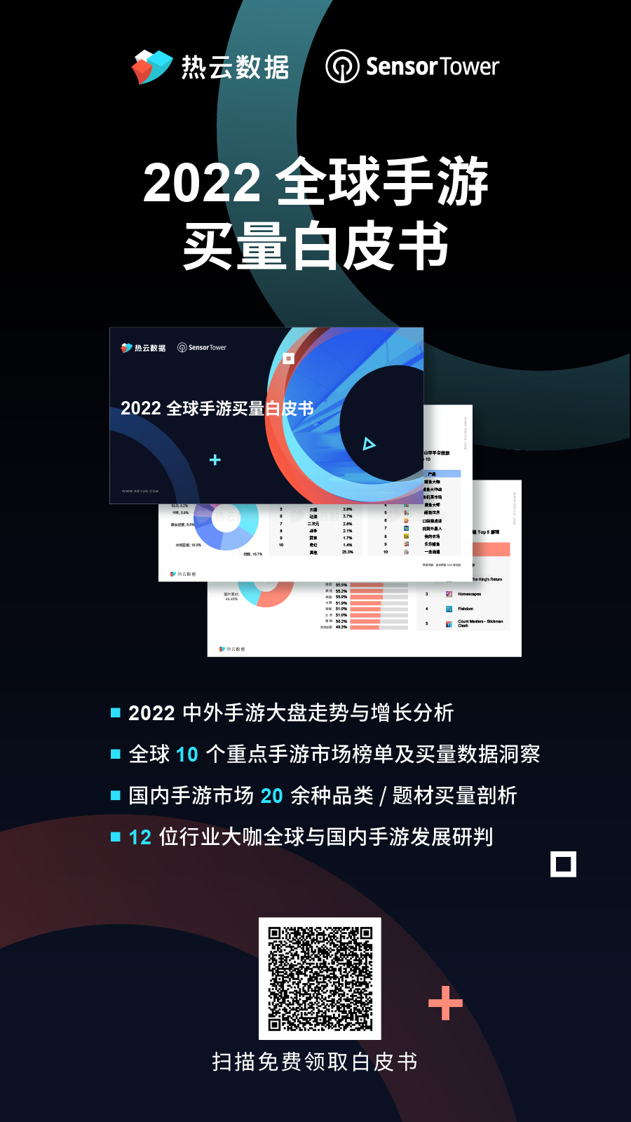 为帮助广大手游厂商更好观察全球移动游戏发展现状及做好2023趋势研读,热云数据特别携手Sensor Tower重磅发布《2022全球手游买量白皮书》,深入剖析全球手游大盘及10个主要买量市场变化趋势,解析重点游戏品类题材买量特征,梳理全球手游市场关键榜单,并邀请多位行业大咖从不同视角对全球与国内手游发展进行研判,帮助游戏行业从业者全方位了解2022年手游整体买量市场趋势,洞察买量增长新方向。