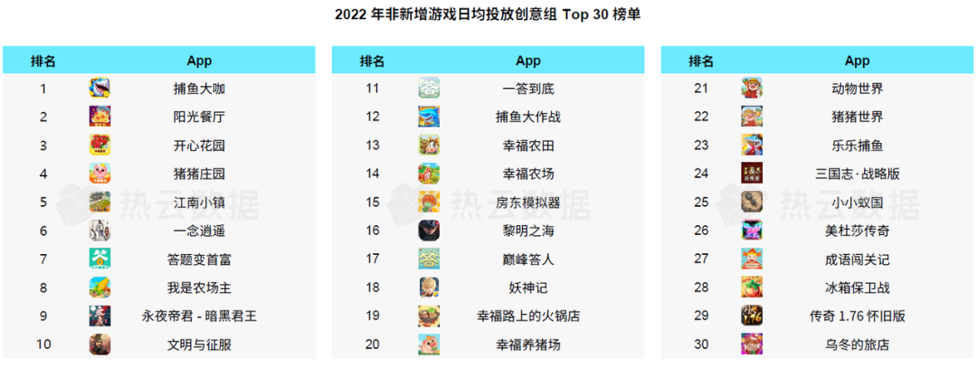 品类买量层面,角色扮演、休闲益智以及网赚类为代表的头部买量优势依旧明显。与去年相比今年中重度游戏在新游买量的表现有所突破,包括动作、卡牌、角色扮演、SLG 等均进入到了新增率 Top 10。其中,动作类游戏跃升幅度最大,超过放置、网赚类等成为了 2022 年手游类型新增率第一,买量竞争热度加剧。