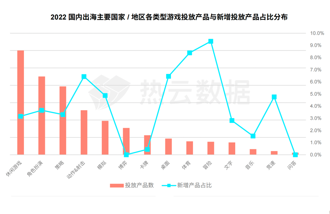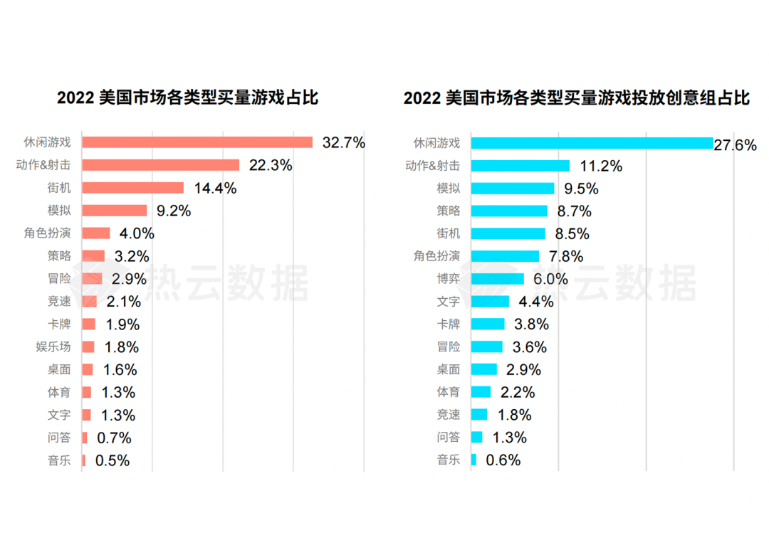 2022下半年,海外新增买量手游占比,虽较上半年下滑降至25%,但该数据仍居近3年的高位。休闲类游戏依旧是全球买量手游类型的 No.1,动作 & 射击类买量游戏数是今年占比排名上升最快的类型。此外,各类型手游加大视频广告投放占比,尤以竞速游戏投放视频广告的占比领衔全品类,音乐类成为下半年视频广告占比提速最快的品类。