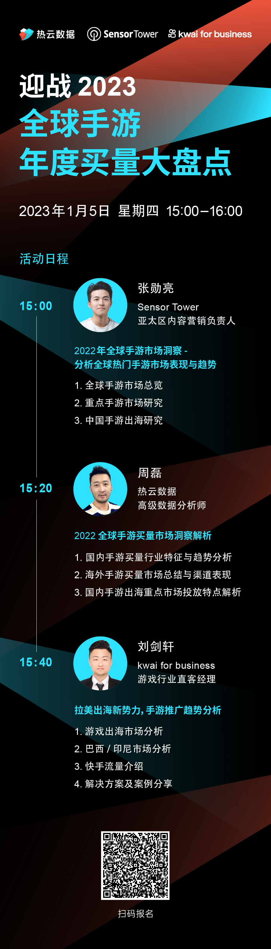 1月5日,热云数据携手 Sensor Tower 、kwai for business共同举办“迎战2023 | 全球手游年度买量大盘点”线上直播活动,深度解读《2022全球手游买量白皮书》,剖析2022年度全球手游市场买量趋势,创意素材打造技巧,与大家一起洞察2023年趋势及市场增长玩法!