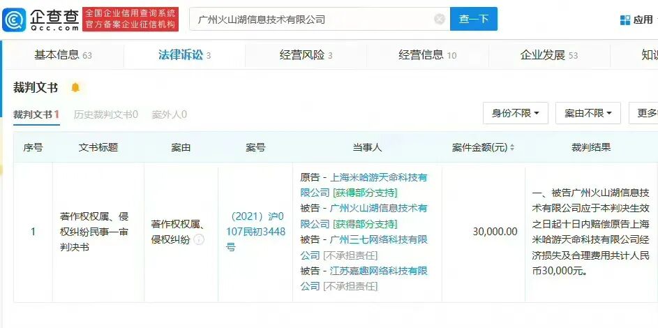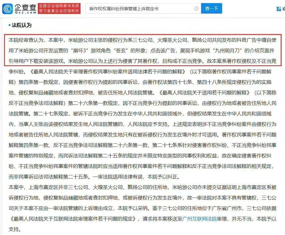 根据企查查,米哈游科技与三七网络科技等公司的侵权纠纷案的裁定书已经公开了。