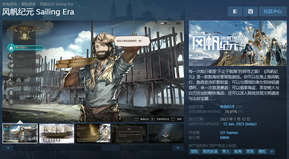 Bilibili发行的航海经营冒险游戏《风帆纪元》现已正式发售,游戏国区原价88元,首发优惠价79.2元。