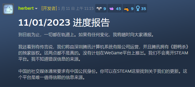 就此,《鹅鸭杀》开发者在Steam社区发布公告专门回应作出否认,表示《鹅鸭杀》还表示目前暂没有计划登陆WeGame平台,此外还澄清目前只在Steam平台更新官方消息。