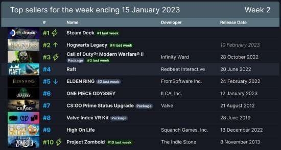 3、Steam一周销量榜公开,V社掌机Steam Deck依旧稳居第一,尚未推出的《霍格沃茨之遗》以超高热度排在了第二。