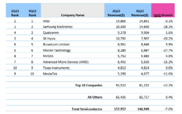 2022年第三季度电子元器件采购调查结果显示,有超过8成的受访企业在第三季度遭遇了消费终端砍单的经历。此前,IC设计企业抢产能抢翻天,为了后续能顺利取得产能,陆续与晶圆代工厂签订长期产能保障合约,晶圆代工产能爆满。“缺芯潮”结束后,为了及时止损,厂商赔钱也要砍单。有本土IC设计公司表示:“随着今年第二季度起市场景气急转直下,第三季度又更加严峻,芯片设计企业库存水位不断升高,为避免库存发展至难以控制的情况,部分公司已在第二季度、第三季度减少投片,并向晶圆代工厂支付当期投片未达量的罚款。”据知情人透露,按照行规,终止合约要赔偿合同金额的30%左右。例如,全球笔电触控板模组暨与触控屏幕IC龙头义隆提前解除与晶圆代工厂签订的三年期产能保证合约,并支付违约金,将导致季度营收锐减29%-36.1%;早些时候,射频龙头厂商Qorvo削减联电订单量,违反了双方此前签署的长期合同,支付了高达1.1亿美元违约金。Qorvo财报计提长单违约支出 (资料来源:Qorvo财报)群智咨询预测,整体芯片市场的库存调整周期将至少持续至2023年下半年。种种现象都凸显了半导体行业整体景气度的低迷。作为半导体市场晴雨表,消费电子的不景气率先会影响到存储市场。对于存储厂商来说,2022年,尤其是2022下半年,局势格外艰难,存储市场萎缩严重,受其影响,全球前三大存储厂商三星电子、SK海力士和美光科技今年第三季度的营收额都大幅下滑,三星营收环比下降28.1%,SK海力士销售额下降超过26%,美光下降27%以上。Q3全球芯片销售额top10(不包括晶圆代工厂)资料来源:OmdiaTrendForce表示,DRAM价格自年初以来就一路走跌,下半年合约价每季跌幅更超过10%,显见需求市场的严峻;NAND闪存市场同样呈现供过于求的状态,导致第三季晶圆价格跌幅达30%-35%,预计第四季度NAND价格持续下探。面对存储芯片需求前景继续走弱再加上库存过剩,行业厂商正在做出减产、缩减资本支出的应对策略。1、美光近期将其晶圆开工量减少约20%,2023财年资本支出计划同比减少33%;2、SK海力士表示明年资本开支将同比减少50%以上;3、铠侠从10月起将日本两座NAND闪存工厂减产3成;4、西部数据也发布警告称,将延后下一座NAND工厂的建厂时间;相比之下,三星则看好长期存储器需求,暂未宣布减少2023年投资,保持了逆周期扩产的传统。库存压力扩大、减产缓不济急。DIGITIMES Research预测,负面因素仍持续,第四季度三大存储厂商年营收减幅将扩大至28%。当前,存储产业链面临两难局面:一边是业内降价预期高度一致,上游资源不断降价,成本越来越低;另一边,市场需求疲软,流速显著变慢,竞争杀价加重。这严重打击了下游和终端囤货备货的想法,普遍都是按需拿货。下游下单意愿和吃货能力下降,主动或被动地缩减采购量,维持库存水位。如此一来,原厂库存短期不仅难以回落还接连走高。展望2023年,TrendForce表示,随着库存过剩的增加,存储芯片的价格预计将在明年全年逐季下降,2023年底将持平或降至最低。有业内人士透露,几乎所有终端市场的重大客户都在进行库存调整。当前,一些供应商正在与客户签订长期协议,期望减少库存中的成品,也在努力使库存具有可替代性,以平衡任何需求的变化。非内存企业中,高通、德州仪器和联发科等厂商均预计今年第四季度营收将出现两位数下滑,多数企业将整体需求疲软和客户库存调整归咎于前景黯淡。台积电三大客户包括苹果、AMD、英伟达也都集体下调了订单。据悉,由于苹果手机首批出货目标已经削减了一半,因此苹果在台积电的芯片订单上进行了下调;AMD与英伟达则因为PC市场需求急跌以及“挖矿”热潮的褪去,两家企业在CPU和GPU芯片上的销量不及过去几个季度,因此不得不向台积电表明调整订单规划。此前,联发科已对第四季度5G芯片砍单30%-35%;高通也对高端骁龙8系列产量下调10%-15%。砍掉新的订单之后,去库存成为消化高企的积压芯片的重要手段。CINNO Research 最新发布的集成电路研究和报告显示,2022 年第三季度,中国主要IC设计厂商的平均存货周转天数进一步增至约 216 天。同时,由于库存水位过高叠加需求持续性疲软,本轮半导体周期下行时间恐长于市场预期,IC设计厂商去库存进程将蔓延至2023年上半年。对此,有芯片厂商表示,面对市场需求疲软以及库存高企的现状,在内部,芯片供应商一直面临着寻找消耗过剩库存和实现年终目标的解决方案的压力;在外部,他们需要为逆风做好准备,例如提供更大的价格优惠以及寻找新的增量市场。对于消费芯片库存及周期情况,浙商证券所长助理&产研院科技首席陈杭表示,过去一段时间的实际情况,21Q4-22Q2,需求端开始连续三个季度出现“黑天鹅”,需求自21Q4开始急转而下,半导体库存水位逐渐拉高,市场开始供过于求,22Q4的市场需求降至冰点。这也意味着,供需关系来到最大失衡阶段,去库存速度变缓,芯片库存持续拉升市场高位,进而导致芯片价格继续下跌,全产业链迎来“至暗时刻”。综合来看,半导体产业步入库存调整期,从下游的手机、电脑、电视等终端厂商,到上游面板、各类消费类芯片厂商,不要说补库存,去库存都来不及,现货市场大降价,芯片设计公司支付高额违约金,普遍以自损的方式来逃脱库存高企的旋涡。晶圆厂打折鼓励客户投片