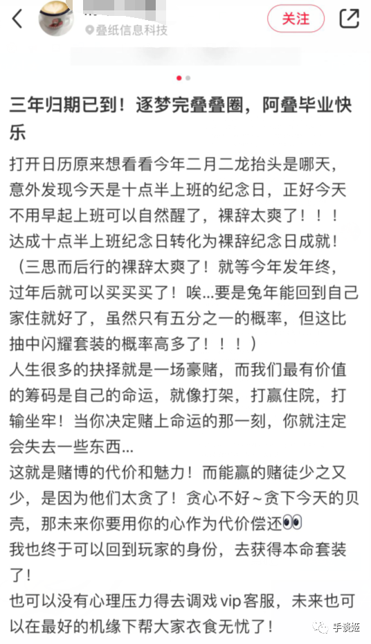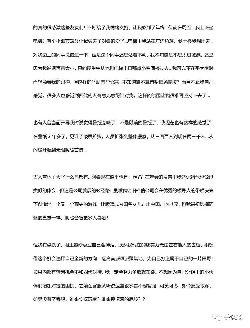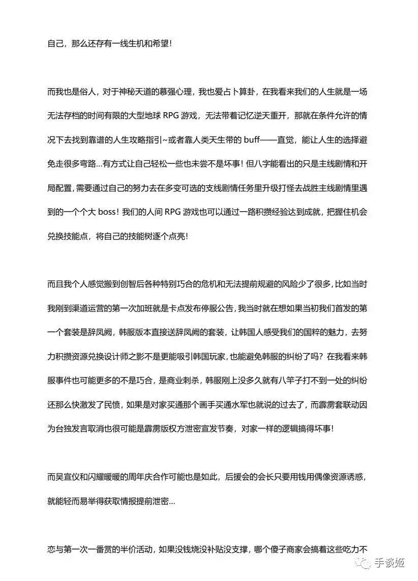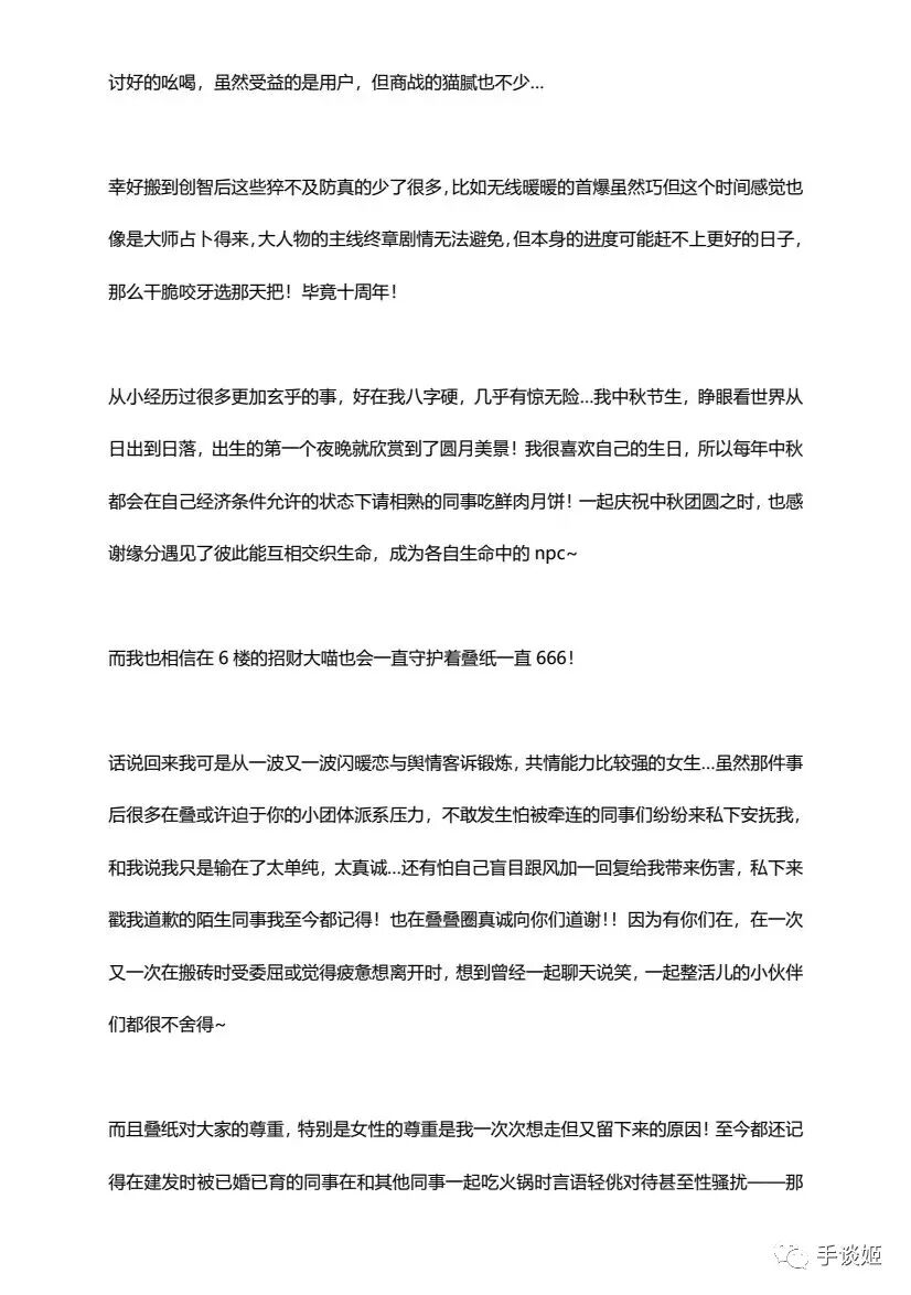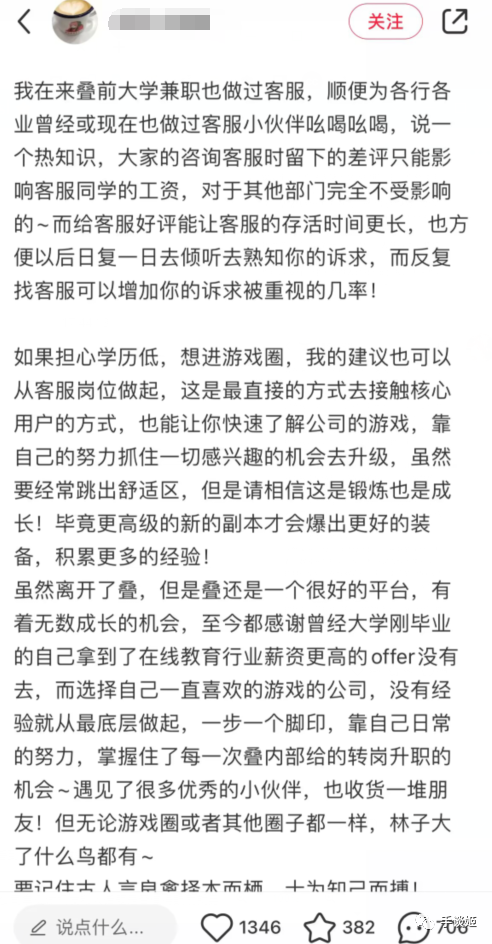 每年在游戏公司离职的人许许多多,姬觉得,像她这种主动分享自己心得感受的行为还是值得鼓励的。很多人对于游戏行业并不了解,虽然向往,但一眼抹黑,她算是扯下一块来让大家看到了。希望她拿够了离职赔偿。