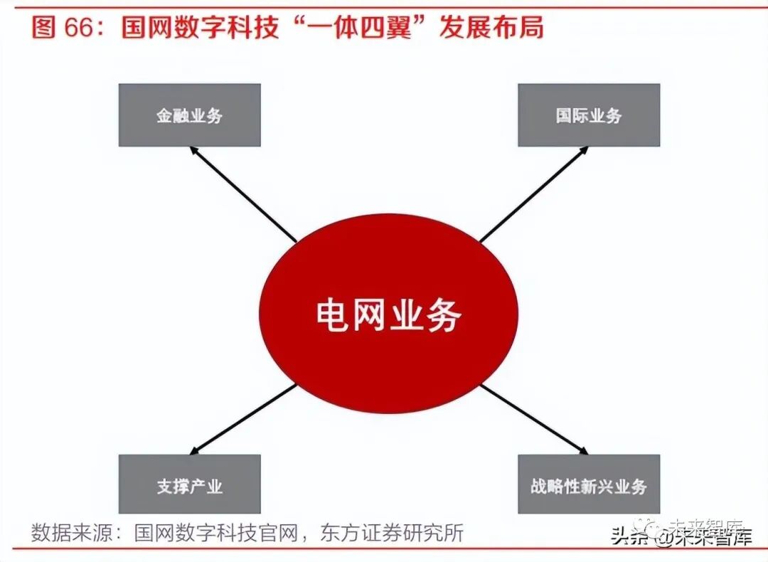 国家电网加快推进电网数字化转型,建设能源互联网推动企业数字化转型。国家电网围绕能源电 力数字化,推进先进信息通信技术、控制技术与先进能源技术深度融合,以国网数科公司来推进 “一体四翼”业务协同联动,加快电网向能源互联网升级,积极打造能源互联网产业生态圈。1) 国网数字科技按照“一体四翼”发展布局,实行“一套本部运作、两翼协同发展”的经营管 理模式,承担“服务电网数字化转型、发展能源数字新产业”的重要使命,瞄准国际领先的 能源数字科技平台企业奋斗方向,为加快建设具有中国特色国际领先的能源互联网企业作出 新的更大贡献。2) “一体四翼”是指以电网业务为主,以金融业务、国际业务、支撑产业和战略性新兴产业为 四翼,做强做优主业,适度相关多元化的战略选择。