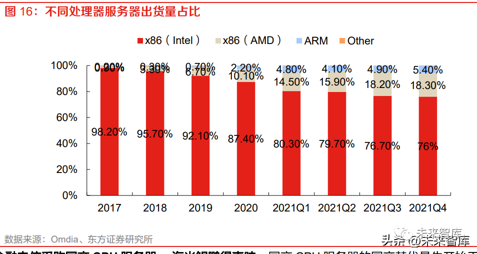 基于 ARM 的 PC 和服务器占比稳定提升。据 Mercury Research, 在 2021 年四季度,基于 ARM 架构 CPU 的 PC 在总 PC 出货量的占比达到新高,同比增加 6.1%,环比增加 1.2%,市场占比达 到 9.5%。据 Omdia, 在服务器处理器市场中,基于 ARM 的 CPU 份额不断提升,2017 年,ARM 占比 0.2%,到 2021 年四季度,其市占率已上升至 5.4%。