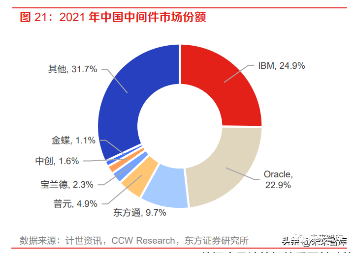 2) 中间件位于数据库平台和应用软件之间,是一种跨平台的基础软件。中间件承载着各行业领 域系统软硬件的互联互通、性能及安全,在数字经济生态建设中作用巨大。伴随着云计算、 大数据等新兴技术,传统产业和信息技术的融合进一步深化,新的经济形态不断涌现,催生 了大量的市场需求。各行业对中间件的需求,不再局限于单一品类的简单替换,而是向融合 包括云原生、数据等更多品类的全栈领域扩展。据计世资讯数据,目前国内中间件市场份额 第一梯队仍然是IBM和Oracle,两者合计占近一半的市场份额。