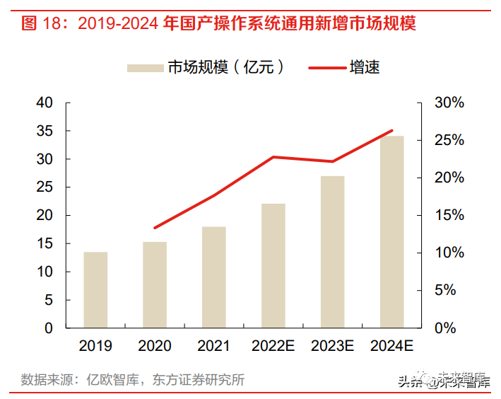 国产操作系统方兴未艾。根据亿欧智库统计,目前我国操作系统国产化率不足 5%,主要应用于 党政行业,未来发展空间较大。预计到2024年,国产操作系统在通用领域的新增市场规模将达到 34.1 亿元。统信软件旗下的 UOS 操作系统和中国软件旗下的麒麟操作系统是国产操作系统领域 的两大主力军。当前党政军等关键领域的操作系统国产化基本完成,金融、交通等行业开始试点 推广。未来随着基础硬件性能提升、国产软件生态逐步构建,国产操作系统将成为推动信创产品 市场化的重要力量。