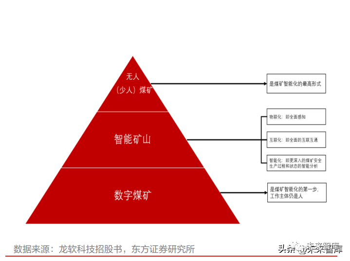 智能矿山是煤炭行业发展的长期目标,煤矿智能化市场空间广阔。信息化有效提升煤矿生产效率 和安全生产水平,按信息化及自动化的应用水平可将煤矿信息化建设过程分为三个阶段:数字煤 矿、智能矿山、无人(少人)煤矿。数字煤矿的工作主体仍然是人;智能矿山分为三个关键部分:物联化、互联化和智能化,其中智能化确保了矿山的安全生产和高效生产;无人煤矿是煤矿升级 的最高形式,大幅提升煤矿工作效率、实现零人身事故的目标。