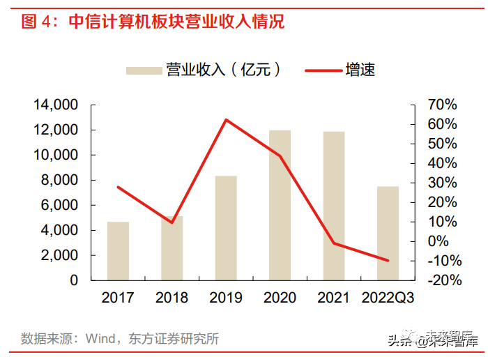 从业绩和经营层面来看,计算机板块前三季度表现不佳。受到 2022 年疫情反复的影响,截至 2022Q3,中信计算机板块实现营业收入 7508.81 亿元,同比下降 9.80%。实现归母净利润 178.00 亿元,同比下降 31.80%,盈利能力下滑明显。在毛利率和净利率方面,截至 2022Q3,中 信计算机板块的销售毛利率为23.36%,较2020和2021年全年水平有提升;销售净利率为2.56%,较 2021 年全年水平略有下降。从费用率的角度来看,截至 2022Q3,中信计算机板块的整体销售 费用率为 6.89%,研发费用率为 8.73%,管理费用率为 5.37%,均较去年全年水平有所提升。截 至 2022Q3,中信计算机板块研发投入为 655.85 亿元,同比增长 19.43%,在板块整体业绩不佳 的情况下,公司仍加大了研发投入力度。