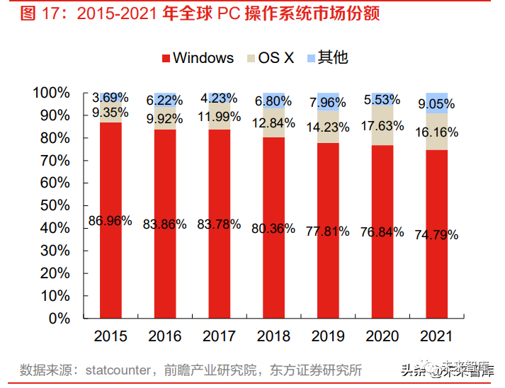 基于 Wintel 的 PC 占据了绝大多数的市场,随着 ARM 架构芯片性能的提升以及苹果电脑销量的带动, 基于ARM芯片的PC市场份额也逐渐增长。PC市场中,联想市场份额远超其他厂家。2021 年,联想达到了约 40%的市场份额,提高了 3.7pct。戴尔、惠普、华硕和宏碁的市占率分别 12.6%、9.2%、8.6%以及 6.2%。