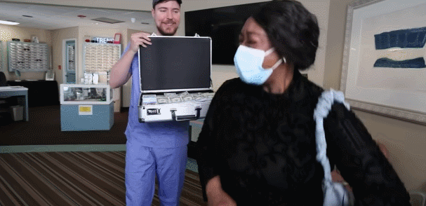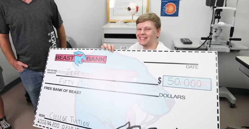 像测试视力是否恢复,部分患者第一眼看到的会是一万美刀;因为眼盲上不了学的孩子,野兽前辈还会加赠5万奖学金。