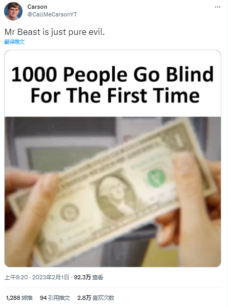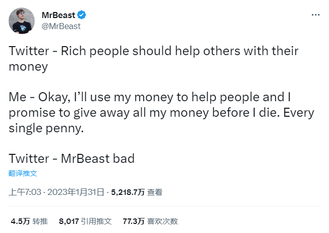 MrBeast:妥,我会拿钱帮别人,并保证死前捐出所有财产。