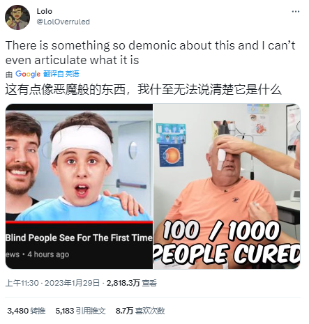 互联网喋喋不休的“正义斗士”早就泛滥成灾,反而把野兽前辈这种干实事的老哥衬得稀缺且高大,哪怕他的动机不一定单纯,但人们确实通过视频关注到了社会问题,且最关键的是,1000个盲人实实在在地得到了治愈。