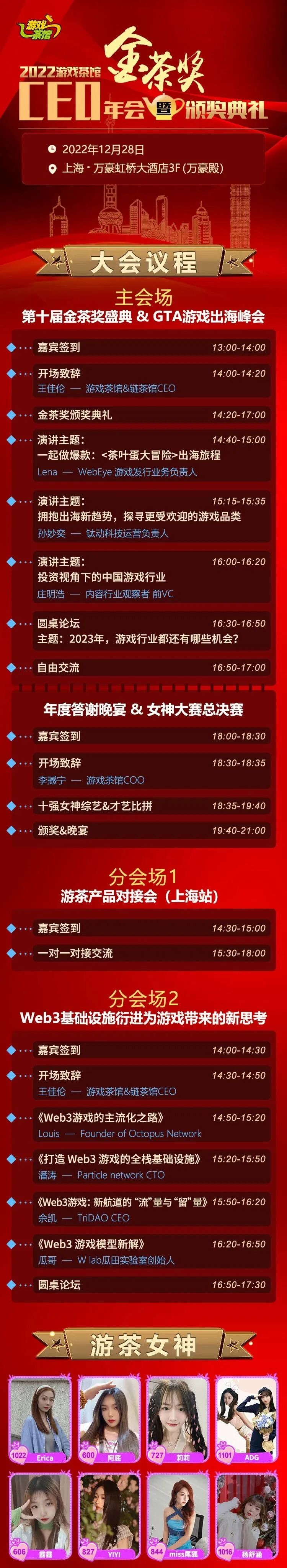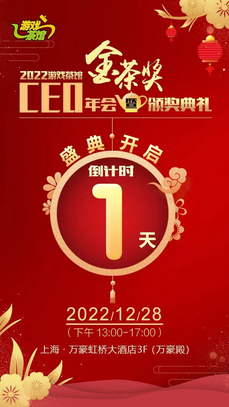 第十届游戏茶馆【金茶奖盛典】将于2022年12月28日在上海万豪虹桥大酒店举办。距离正式开始还有一天的时间,相信各位小伙伴已经迫不及待了吧?不要着急,先来看看茶馆精心准备的一份“金茶奖典礼活动指南”,在活动当天有备无患。