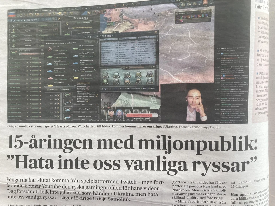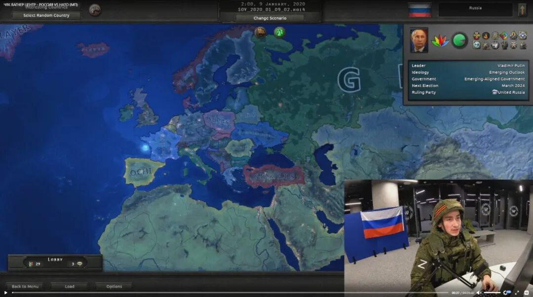 上周末,16岁主播格里沙·普京(GrishaPutin)在俄罗斯平台VK上组织了一场长达四个小时的比赛,游玩二战模拟游戏《钢铁雄心4》。游戏被打过模组,让原本游戏轴心国对同盟国的双方阵营,变成了俄罗斯对抗整个北约。