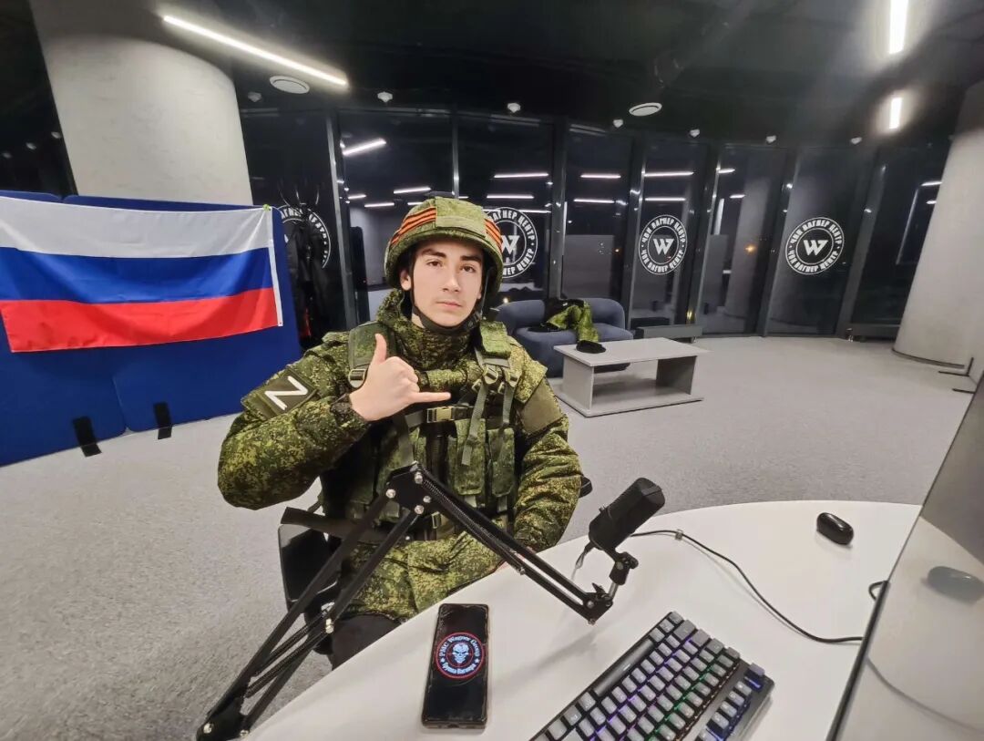 但很快网友发现,格里沙身着军装,臂缝Z字,后面挂着俄罗斯三色旗的行为并非只是狂热军迷的Cosplay,因为他的直播地点,是圣彼得堡的「瓦格纳集团」办公大楼。
