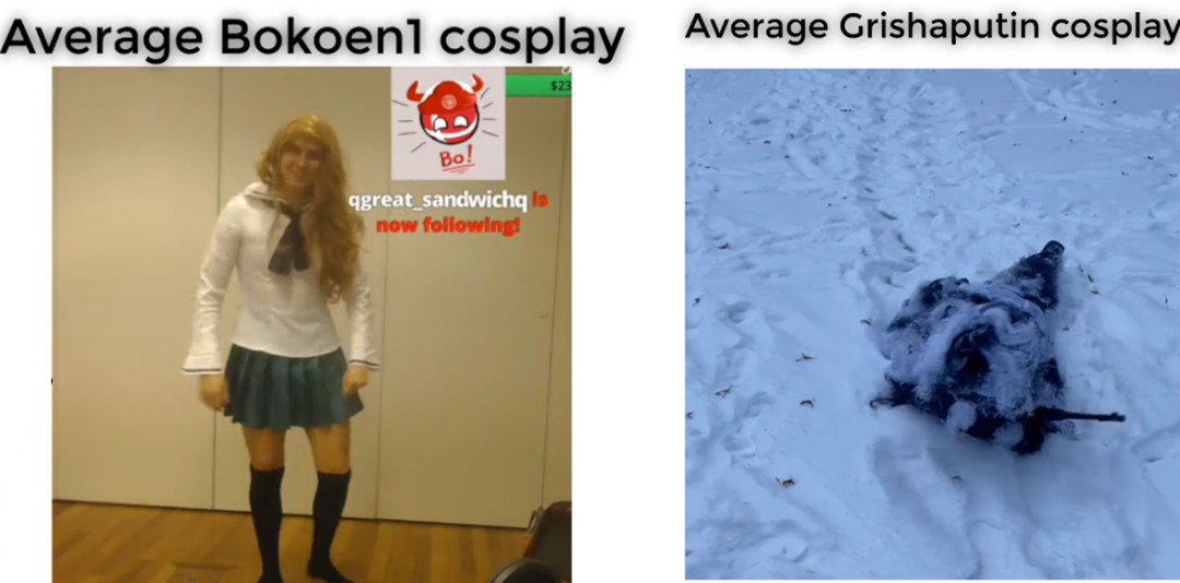 像是去年俄乌刚开战时,他就更了一条叫《比通关艾尔登法环更快》的视频,而像是联动其它《钢4》大Up整狠活,别人都在穿女装,这哥们却在Cos芬兰军。