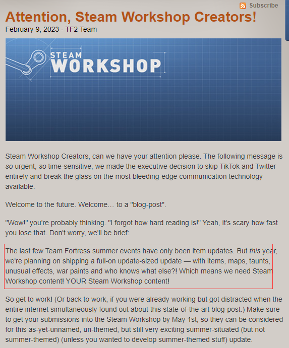 《军团要塞 2(Team Fortress 2)》官网博客发布公告,宣布在今年发布一个全面的更新,包括新物品、新地图、新嘲讽动作、异常效果、战争喷漆等内容。