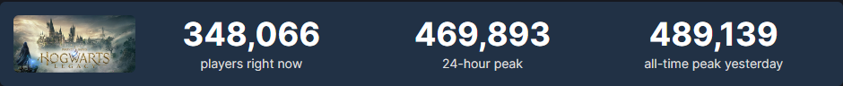 SteamDB 数据显示,开放世界 RPG 《霍格沃茨之遗》在 2 月 9 日凌晨最高同时在线人数达到 489139 人,光是 Steam 平台就有接近 49 万魔法学徒已经提前入学。标准版已于今天 0 时在 PS5、Xbox Series X|S 解锁,将于 2 月 11 日凌晨 2 时在 PC 平台解锁。