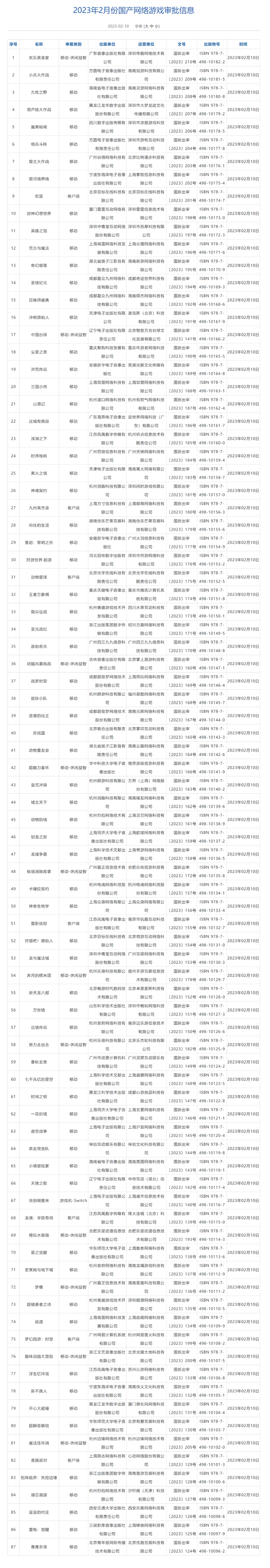 国家新闻出版署公开2023年2月国产网络游戏审批信息,手游《王者万象棋》、Switch 端《快到碗里来》、客户端游戏《梦幻西游:时空》《香肠派对》等 87 款游戏过审,获得版号。