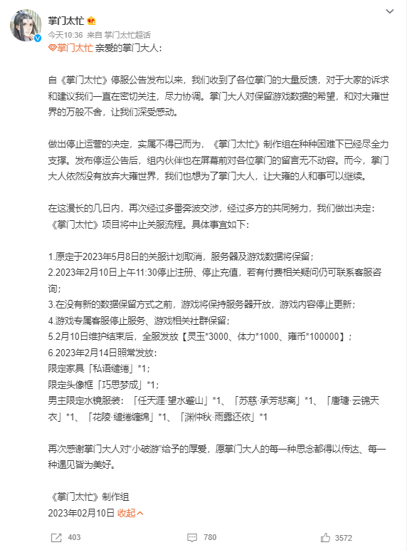 2 月 10 日,女性向手游《掌门太忙》宣布中止关服流程,原定于 5 月 8 日在关服计划取消,服务器及游戏数据将保留,但是在今天上午 11 时 30 分停止注册和充值服务,在没有新的数据保留方式前,游戏内容停止更新,将保持服务器开放。