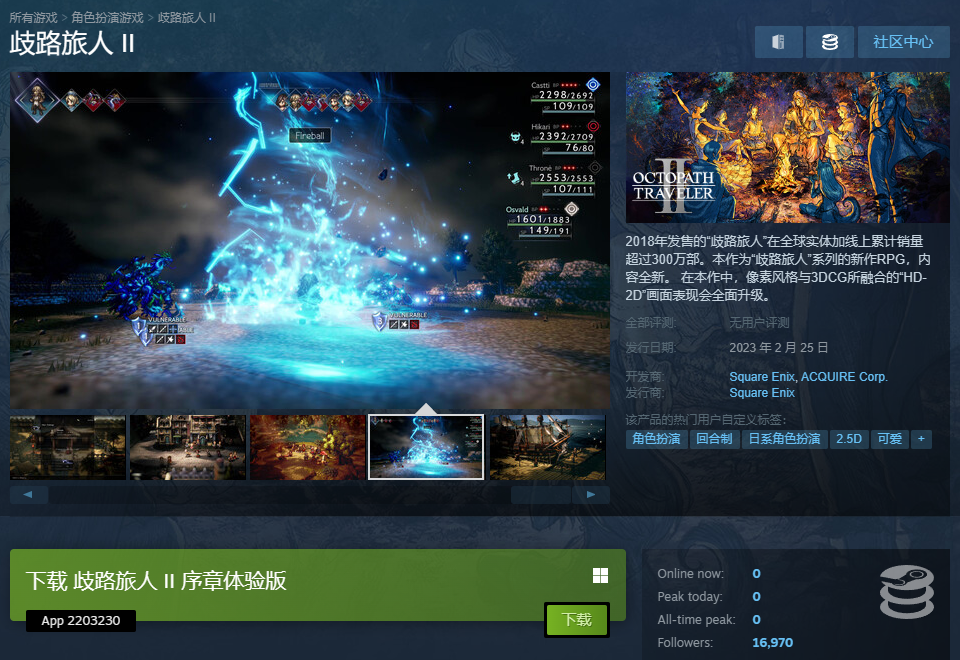 《歧路旅人2》将于2月25日发售,国区售价379元,支持中文,试玩存档可继承至正式版。