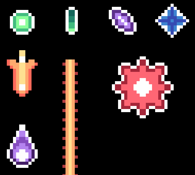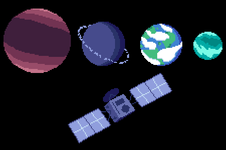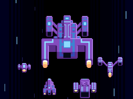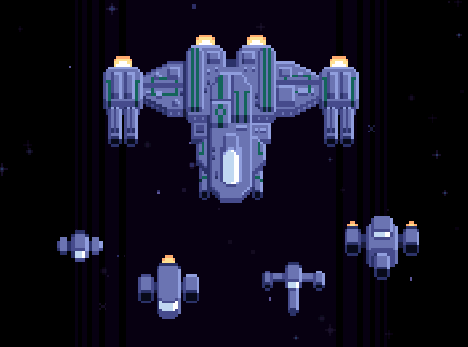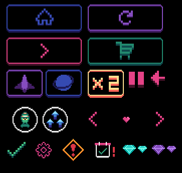 内容包括:玩家操作的飞船,4 张太空场景图,5 种爆炸特效,14 个敌人(普通状态和受损状态动画),3 个 Boss(普通状态和受损状态动画),8 种不同的子弹,9 颗小行星,4 颗行星,2 种地雷(含倒数动画),2 种硬币,2 种宝石,1 种心形图标,8 个按钮,10 个杂项 UI 图标,1 种卫星。