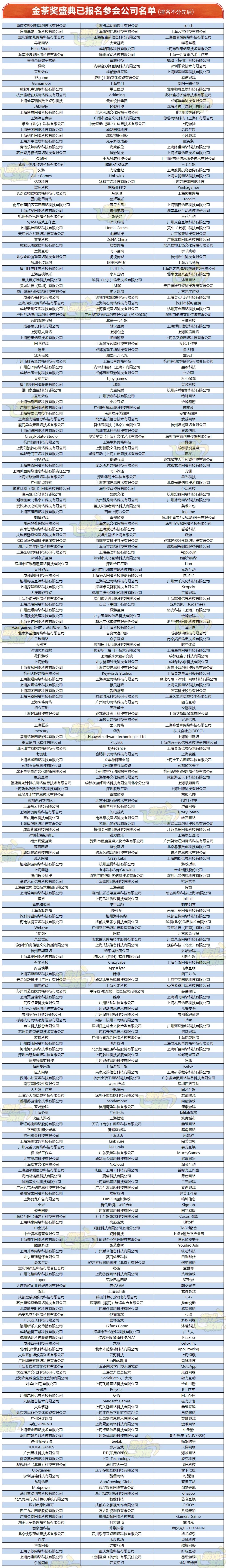 此前,在经过一个半月的激烈角逐后,第十届金茶奖的十六项大奖的最终获奖名单终于出炉,游戏茶馆再次恭喜各位得奖小伙伴,并在12月28日·上海恭候大家的光临。此外,让我们欣喜的是,随着金茶奖评选、投票以及评定依次进行,报名参与金茶奖颁奖典礼的公司也越来越多。截至12月20日,目前已有超过800家国内外企业报名参会,今天,这篇文章将来揭晓这份阵容庞大的参会企业名单,快来看看是否也有你的公司呢?(在此温馨提示,参会报名仍在进行中,作为行业中不可或缺的一员可千万别错过哦,在文末即可扫码参与)。