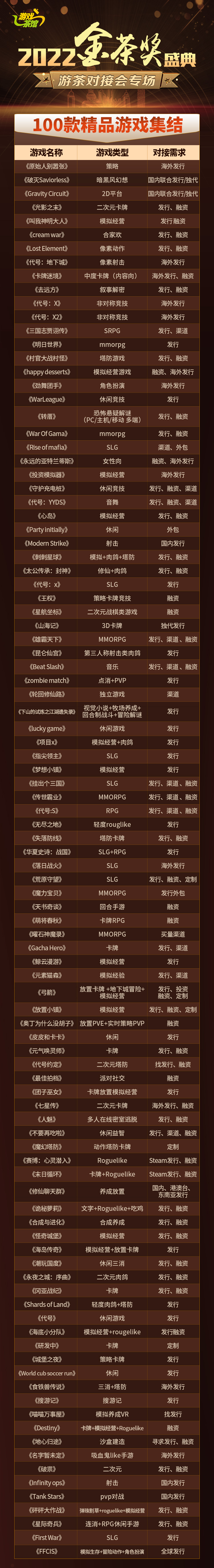 在这里,茶馆经过长时间的信息甄别和筛选后,也整理出了符合业内各位小伙伴需求的产品名单,一共包含100+款不同合作需求的游戏产品,各位有合作需求的小伙伴快来现场pick你的心仪产品吧!