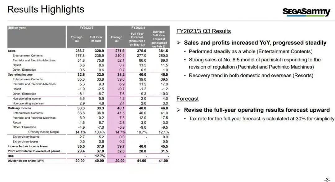 2月9日,世嘉公布22-23财年第三季度财报,其季度销售额为2719亿日元,同比增长14.9%,季度利润为382亿日元,同比增长17%。![]()