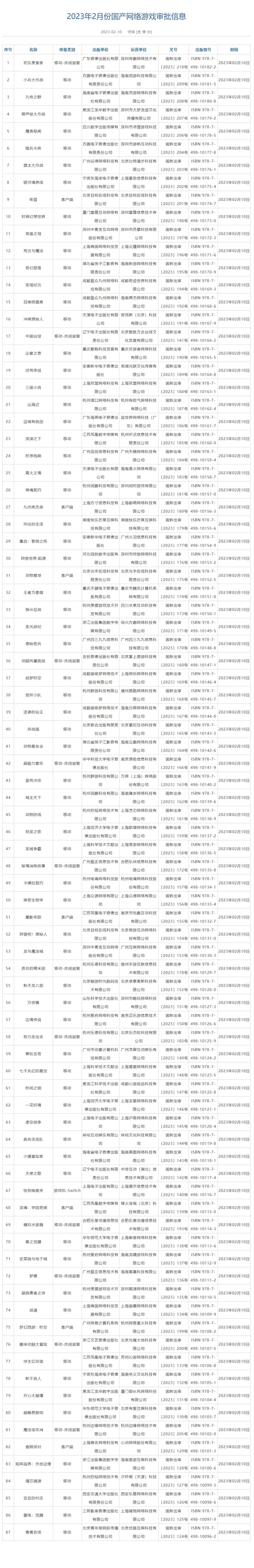 2 月10日,国家新闻出版署公布 2023 年 2 月国产网络游戏审批版号名单,共87款游戏过审。其中79款移动游戏,7款为PC端游戏,1款为Switch游戏。