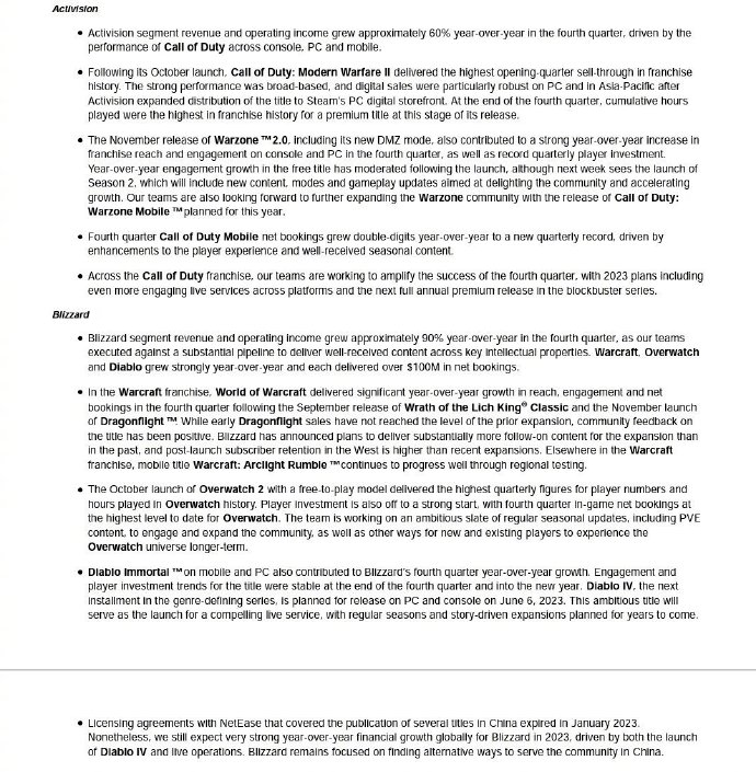 具体到暴雪部门,其Q4 收入同比增长 89.5%,达到了 7.94 亿美元,营收增长 93%。这主要归功于《守望先锋2》的推出,以及《魔兽世界》和《暗黑破坏神》系列的持续增长。另外,暴雪在财报中再次表示,公司仍在寻找“替代方式”为中国玩家提供游戏。![]()
