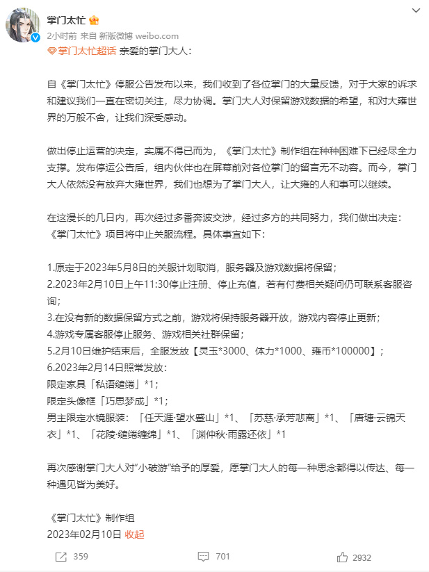 灵犀互娱SLG新作《三国志·战旗版》将于3月17日开启公测,该游戏由光荣特库摩官方授权,研发历时长达三年。游戏制作人早前在品鉴会上也透露了他们的野心:想要做出一款“既保留同盟战略的社交合作乐趣,也带来战术战斗与三国世界探索乐趣”的新三国策略游戏。现在他们的交卷时间也开始倒计时了。2月10日,米哈游旗下的《崩坏:星穹铁道》开启“跃迁测试”。同日,据App Store预约界面显示《崩坏:星穹铁道》将于4月26日推出。对此,米哈游方面给出回应称:正式上线时间请等待官方公告。乙女游戏《掌门太忙》宣布终止停服流程2月7日,古风乙女恋爱游戏《掌门太忙》发布停服公告,称该游戏将于5月8日停止运营。届时,在关闭服务器的同时,游戏内的所有账号数据及角色资料等信息也会被全部清空。此消息一出,官方就遭到了玩家的不满和声讨。2月10日,《掌门太忙》宣布终止停服流程,服务器及游戏数据将保留。![]()