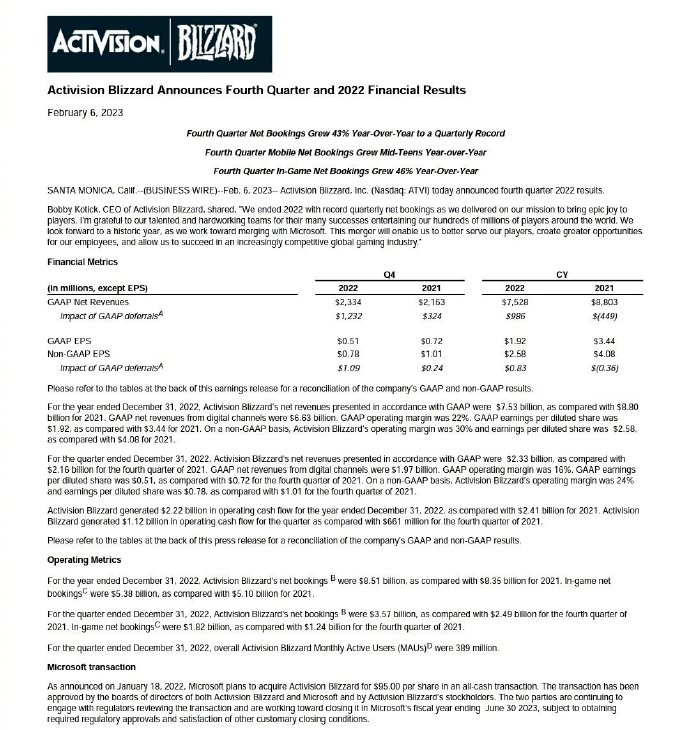 2月7日,动视暴雪公布了2022财年Q4财报和全年财报。报告显示,2022财年,动视暴雪的净营收为75.28亿美元。其中,第四季度净营收为23.34亿美元,相比之下上年同期为21.63亿美元;净预定收入为35.7亿美元,相比之下上年同期为24.9亿美元;净利润为4.03亿美元,与上年同期的5.64亿美元相比下降29%。